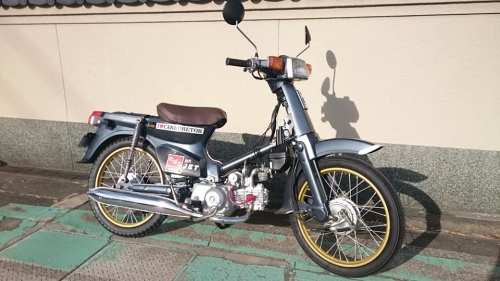 他人とは違うバイクで???2018-11-02 at 20:02PMバイク納車へ行った合間、道路をウロウロしていたワンちゃんが。 車道に飛び出し、車に轢かれそうになっている姿を見て「こりゃぁいかん」と保護。 首輪をしていないけども、室内犬だから付けていないだけかも。 取り敢えず交番へ行き、拾得物件預かり書に記入。 ワンちゃんは、警察署や保健所に・・・では無く、取り敢えず私が預かる事に。 店に戻って暫くして、県警より電話で「飼い主さんが来ましたので、そちらの住所と連絡先を教えております」と。 後に、飼い主さんが居らしてワンちゃんも尻尾フリフリ。 御礼なんて良いのに、わざわざ有難う御座いました。 いやはや良かった良かった そして、見た目はカブ90の50カスタム。 前後タイヤやプラグにオイル他、ハンドルグリップやステップゴムラバーにミラー等を新品交換メンテナンスするついでに、ペイントして御洒落になりました♪ 撮影時は「納車前試乗中」で、リアキャリア&白いレッグシールドは外しています。 御購入いただいた九州大学生「個性的で良いですね サイドカバーはカーボン風にして、昭和レトロチックな看板ステッカーを。 セル付き4MTカブ 実は、シートは張替えのみでは無く、シートベースをカットしてフラットな形状に 強固な塗料にてホイール塗装、美しい。 カブ90の頑丈フレーム&外装一式でも、ちゃんと50登録が可能。 バイクで通学される方は沢山居ますが、他人とは違う個性的な車両で差を付けるのもアリ。