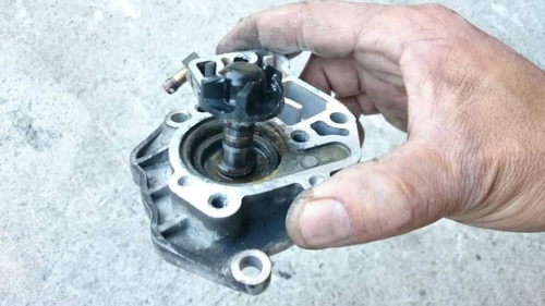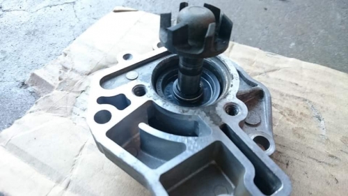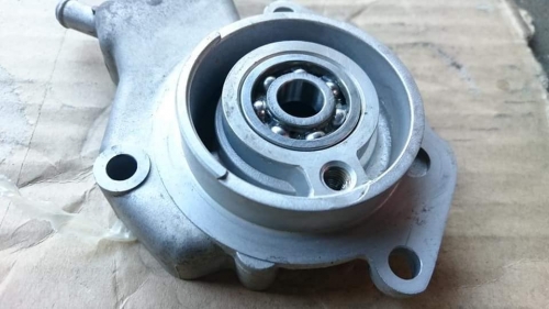 液体を少し流し、インペラ回して漏れのチェック。 ウォーターポンプ取付け、クーラント液を補充してエア抜き。 他仕事の合間、点検試乗へ。 冷却系統のメンテナンス完了後、今度はメーターギア周りの故障対策を。