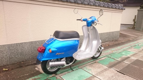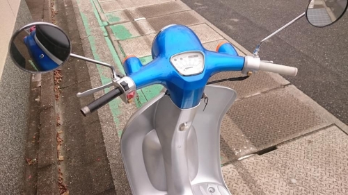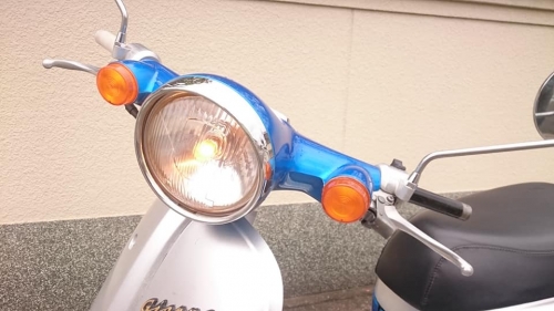 外装ペイントだけでは無く・・・2018-11-18 at 18:55PMホンダ・2サイクルジョルノ。 1992年3月発売より26年経過。 2サイクルエンジンはまだ元気とはいえ、それなりです。 ジョルノに限らず、カブやディオ・ジョグ等々。 当店では、整備しながら綺麗にして「他所では見掛けない1台」にしたいと考えます。 今回はキャンディーブルーにキャンディーシルバーの2色でペイント 純正のカラーデザインを真似せず、敢えて自己流でライン取りされています。 全バラですので、当然フレームやホイール他、パーツの1つ1つを単体でリペイントしております。 メッキパーツは兎に角研磨、ピカピカです。
