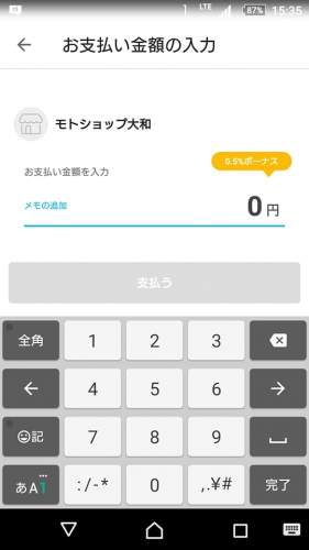 読み取りますと、当店決済画面が出てきます。 店員確認の元で決済しまして、取引き完了です。