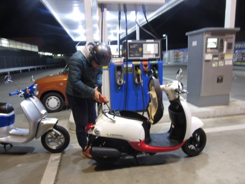 横断待ちの歩行者や自転車の動きに、少し気を配ってみるだけでも接触事故は防げます。 沢山走り、ガソリンスタンドにてガソリン給油の練習です。