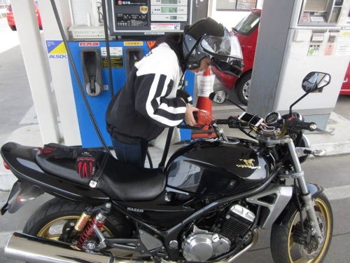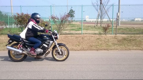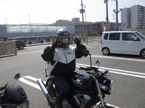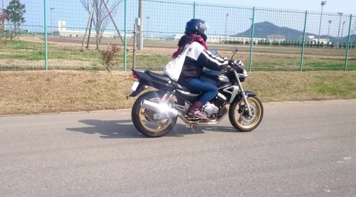 1速でスタートして2・3・4・5・6速へシフトアップ。 今度は、無理なく6・5・4・3・2・1速へとシフトダウン、エンジンブレーキの挙動をマスター。 絶対に立ちゴケや走行中の転倒事故に遭わせない教え方、無料とか関係無く責任感です。 T様、一生懸命に覚えようとする姿勢が素晴らしいです。 それでは、店長も同排気量のオートバイを店から出しまして、2台で出発。 沢山走り回っては止まり、危険予測や走行方法などを口頭説明します。 ガソリン給油の練習も見事にマスター♪ 「怖い怖い」と言っていた彼女、いつの間にか「バイクめっちゃ楽しい♪」と仰っていました。