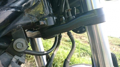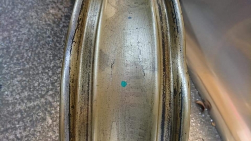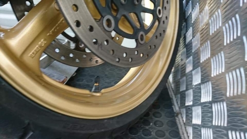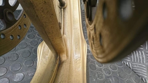 フロント周りをバラし、フレーム歪みチェック。 フレームは曲がりや捻れ無し、良かったです。 では、曲がったフォークやステムベアリング交換。 ステム三ツ又は少し歪み有り、修正します。 ホイールは中古を仕入れ、純正ゴールドペイント。 フォークオイル等は新品、ブレーキ周りも点検。 左右で厚みが少々違ったディスクは調整を。