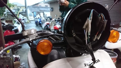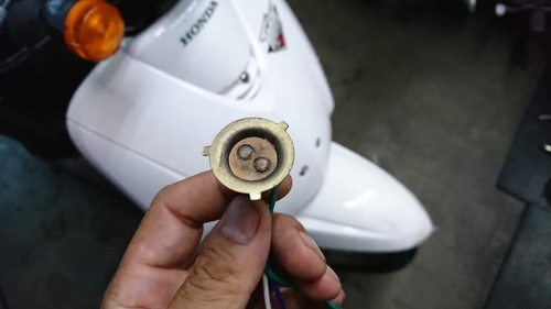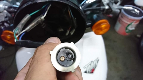 本日水曜定休日は「バイク登録」等へ★2019-08-28 at 10:00AM昨日から続く豪雨。 洪水や河川氾濫が起きぬ様、只々願うばかりです。 バイクを運転される皆様も、気を付けて下さいませ。 そんな中「原付のライトが点かない」修理依頼。 当然、電球交換ですが・・・ ソケット部分、焼けています。 これでは、電球交換しても直ぐに(*_*) 当店ストック品、良品を無料プレゼント。