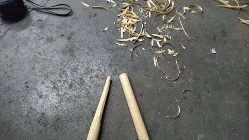 と、そこへ「マイバチ作ってください」と子供達が来店。 木を削ります。