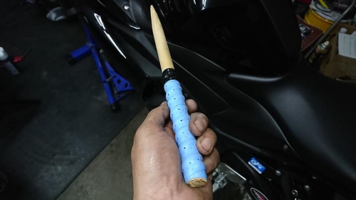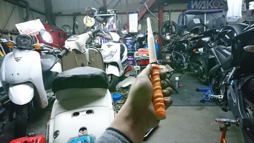 「あと2本作って」・・・何だとΣ( ̄ロ ̄lll) 今度は、ブルー色のテニスグリップ仕様で完成。 ゲームセンターで良い成績が出ると良いですね。 ーーーーーーーーーーーーー そこへZZ-R1100乗りK様の御来店です。 就職で愛知県に居るK様 「帰省したので御土産を」と、わざわざ有難う御座います♪ マイバチ作りは終わりましたので、さぁ残業して本業開始!! 0 コメント : コメントを書く :