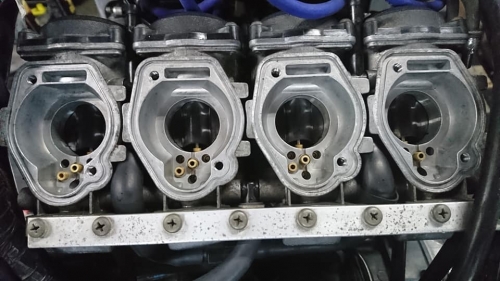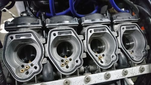 まともにアイドリングしないので、キャブレターもメンテナンスして組付けます。 新品ガスケット。 エアークリーナーボックスとキャブ接合部に挟まぬ様、気を付けて組みます。