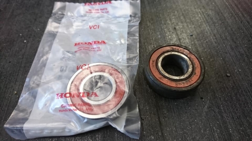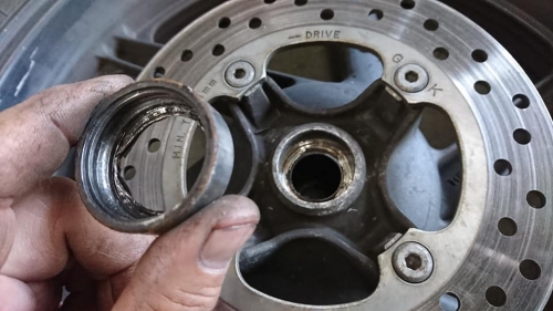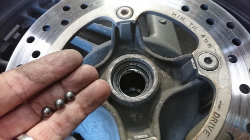 モトショップ大和「オートバイ路上教習」2020-03-08 at 15:51PM「走行中にバイクがグラグラします」 「リアブレーキを踏むと、効く時と効かない時が有ります」 「加速が悪く、とにかくガチャガチャうるさいです」 そんなオートバイ、原因はホイールベアリングでした。 すんなり抜ける方から抜き取り、交換します。 実は、リアホイールを外す前に覗き込んで「あっ・・・」 オイルシール隙間に、ボールがポロポロこぼれてきていました。 命に係わりますので、自走で無事に来れたのが奇跡です。 アウター、叩いたりせずにソ~ッと抜き取ります。