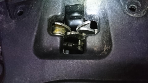 エンジンオイル交換ついで、シートが閉まらないと御悩みのダンク(AF74)。 シートがロックせずに開閉し放題だと、中に荷物が積めませんね。 シートロックキーにアクセス、外装を剥がさないといけません。 後ろ側だけをバラしたい場合でも前面からサイド、そして後ろをバラす順序。