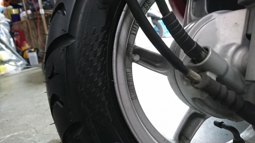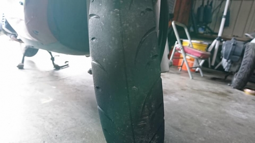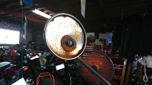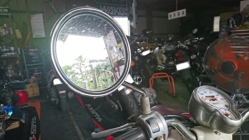 いつもはダンロップ等を使用しますが、今回からティムソン社タイヤも導入。 サイドのチェッカーデザインが良いですね。 ティムソンタイヤ、結構な好評です。 「さぁ完了🎵納車だ・・・んん???」 見てしまった・・・左ミラー使えないやん😭 部品庫を探すも、YAMAHA左ミラーが無いから「販売車両」から外して付けます。