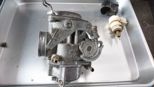 エンジンとキャブを繋ぐインシュレーターに亀裂が有ります。 二次エアー吸い込んで、非常に調子の悪かった筈です。 キャブ外観が汚れていますので、先ずは綺麗に。 インシュレーター、ゴム弾力性の良い物と交換します。 その後、キャブレター中身もリフレッシュ。 前タイヤにバッテリーは新品交換。