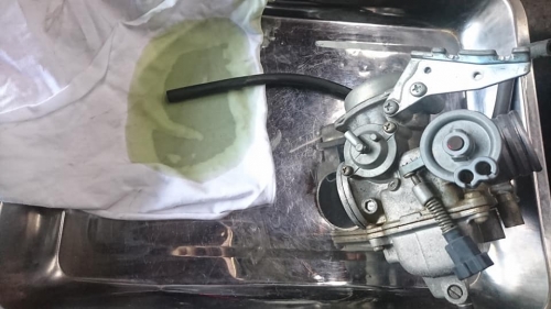 キャブから出てくるガソリンが緑色、そして異臭が。