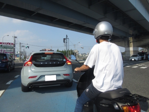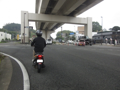ここまで行って練習するのも、モトショップ大和ならでは。 右折待ちの乗用車や横断者が居る場合、どうするかをアドバイス。 二段階右折を一緒にして、覚えてもらいます🎵 ↓二段階右折をしなくて良い交差点を右折、最初はドキドキしますね↓ 大丈夫です、慌てずに右左折出来るコツを教えます。 それでは、ガソリン給油の練習です。