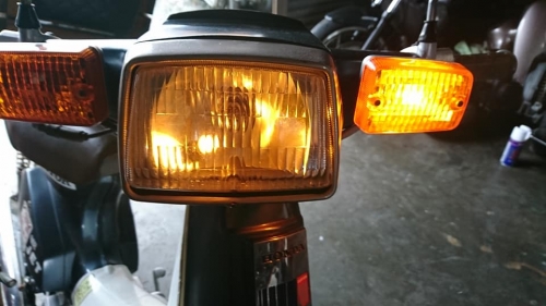 そんな本日の降水確率は、何と福岡県のみ0%😀 珍しかですね。 それでは、九州大学生のカブカスタム50。 台風9号で倒れ、破損した左ウインカーの交換修理を。 ウインカーはシルバー塗装されていますので、ストックしていたウインカーを塗装します。