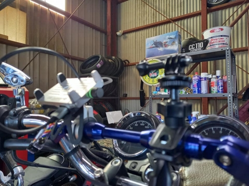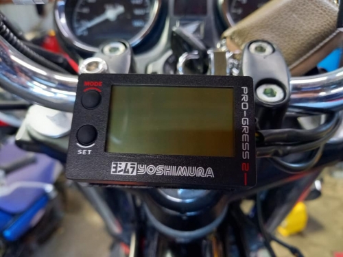 バイクも健康管理は大切2021-01-25 at 17:17PMM様CB750のハンドル周り、アクセサリーが沢山です。 CB750の油温・電圧測定が出来、時間も分かる優れ物。 そんな「ヨシムラ・プログレス2」見やすい位置を探します。 仮付け後、接続確認。