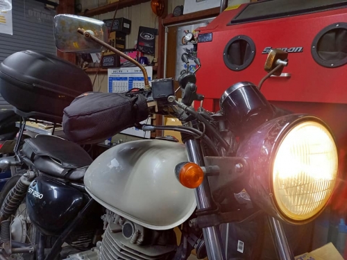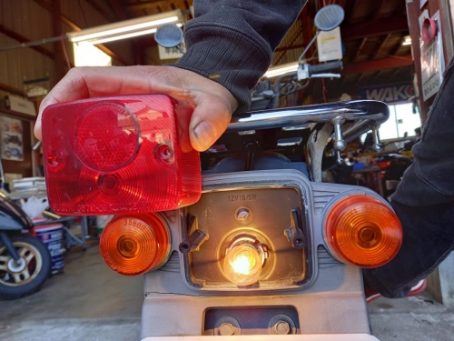 電球が切れており、危険なテールランプは修理サービス。 コロナ禍で経済が大変なのは、私達社会人だけでは有りません。 学生さんのアルバイトも同様、気持ち御安くさせて頂きました。 モトショップ大和は、皆様と共に今を乗り越えれたらと考えます。 ーーーーーーーーーーーーー その後、足回りを14インチ➡17インチ化されたカブ。