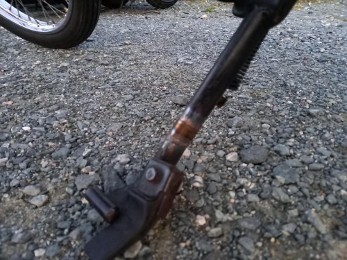 サイドスタンドを切断、2cm継ぎ足して溶接。 スタンドのロング化で、安心して停車出来ます。