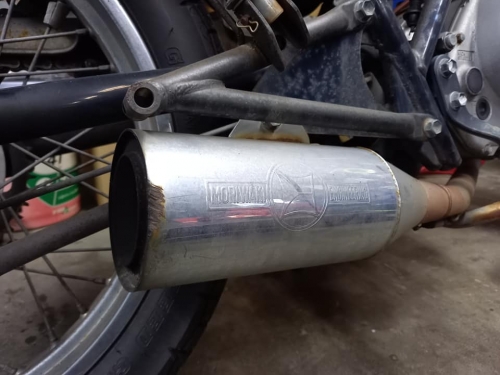 H様、気を付けて御帰り下さい😀 ーーーーーーーーーーーーー 走行中、ハンドルが常にフラフラしていたST250。 修理完了で納車。 では無く、磨いて綺麗にします。 先ず、くすんでいるモリワキマフラーから行います。 車両搬入時から汚れていたから関係ない。 店側が、そこまで綺麗にする必要は無い。
