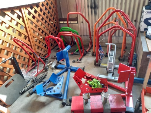 オンオフ問わず、バイクを支えるメンテナンススタンドを拭いて綺麗に。