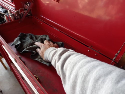 長年使用している工具箱、買い替えはせず綺麗に清掃します。 拭けば綺麗になり、また使えますね。 トルクレンチ等も、定期補正に。