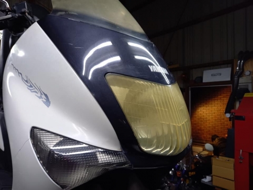 黄ばんでいるヘッドライトやスクリーンも磨きます。