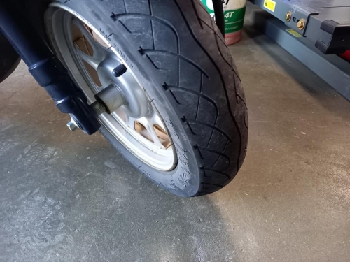 安心を・・・???2021-05-05 at 18:18PMGW営業最終日、女子大生N様分ジョルノ(AF77)納車前の試乗へ。 アイドリングストップ機能で燃費バツグン🎵 可愛いデザインですが、ブラウン色が渋いですね。 サービスでタイヤ交換します。 ダンロップ・ランスクートD307 80/100-10