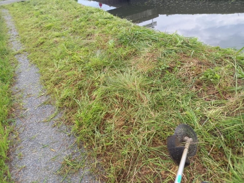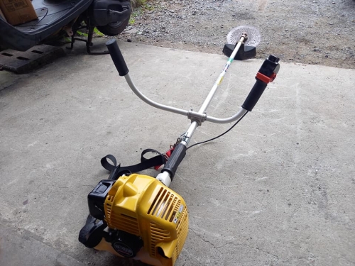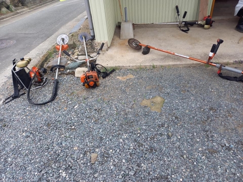 草刈り機に2サイクル混合ガソリン入れて、清掃開始。