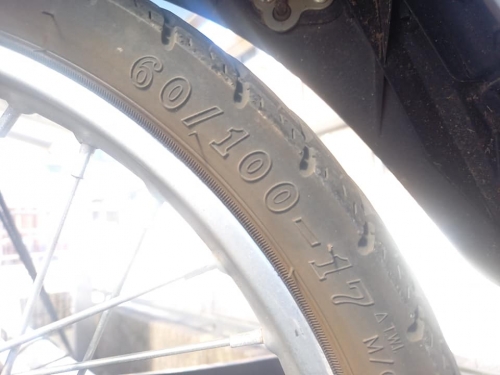 すると「パンクしましたのでタイヤ&チューブ交換を」との事で引き上げへ。 カブ50、前後共に60/100-17というタイヤサイズ。 2.25-17でも良いでしょうが、そこは規格サイズ通りで交換。