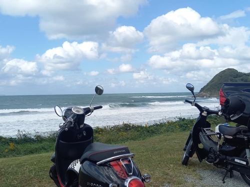 カブに乗ってサーフィン✨危険回避✨2時間路上教習2021-10-17 at 18:18PM数年前に車両御購入、九大生の御来店です。 Dio-Z4大切に乗られています。 「最近、フラフラして危ない気がします」との事、Fタイヤの空気圧ゼロ。 九大生「タイヤ変えた方が良いですかね?」 私「すり減っていますし、そうですね」 DUNLOP D307新品交換完了です。 すると「ライトのロービームが切れています」と。 九大生「持ち合わせが足りないので、今度修理してもらえますか?」 私「ライト球交換代、いつでも構いませんよ」 学生もコロナ禍で大変、しかしライト点灯しないと夜が危険。 御互いの信頼関係の上、いま出来る事をしてあげたいものです。 ーーーーーーーーーーーーー それでは九大生N村様、リトルカブ納車時★路上教習開催です。 本日は強風ですので、運転中にフラフラしない様にアドバイスを。