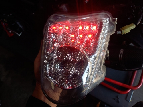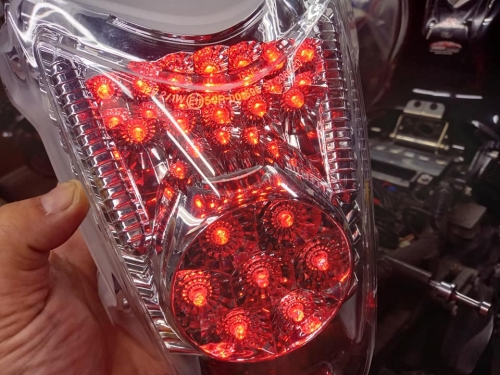 エンジン保護&ドレスアップ効果の有るジェネレーターアルミ製ガード。 重量有るリッターバイクは、立ちごけ程度で曲がります。 難なく付いていますが、少しの曲がりが気になります。 AGRAS アグラス製レーシングスライダー。 プレス機で、ゆっくり圧を掛けます。 1回で直そうとせず、計測してはプレスを繰り返して曲がり修正。 そして、数発が接触不良でしたLEDクリアテールランプ。