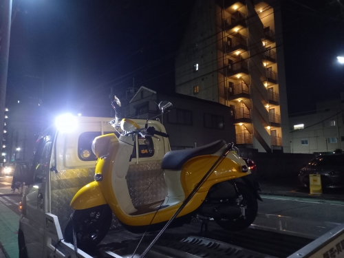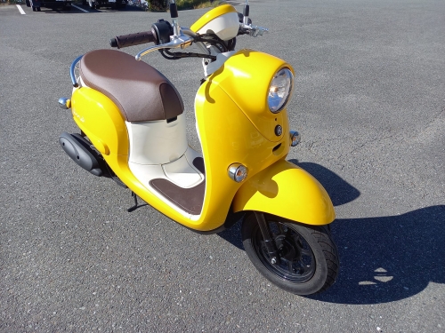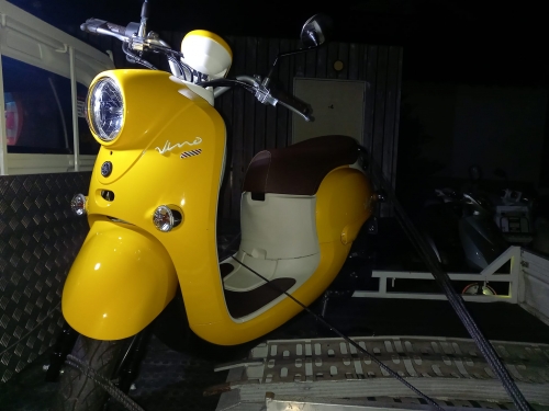 当店では人気★黄色ビーノ★2021-11-27 at 18:00PM博多区から来られた御夫婦「黄色ビーノに乗りたい」との御要望です。 黄色ビーノ新車は2019年で生産終了モデル。 「何処の店も、黄色は中古すら有りませんでした」との事、当然ですよね。 ーーーーーーーーーーーーー 御予算を聞き、ワンオーナー走行1.000km現行型VINOを見付けました。 九州外の販売店様から分けて頂き、輸送会社へ受取りに行きます。 1~2年前の車両ですから当然ですが、物凄くキレイです。