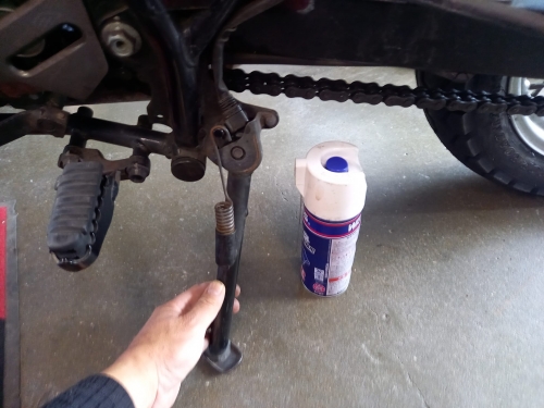 それでは、九大生S様CB223Sを元岡校区に引き上げへ。 タイヤにバッテリー、御依頼分を済ませて車体点検をします。 サイドスタンドの動きが悪いので注油、良くなりました。