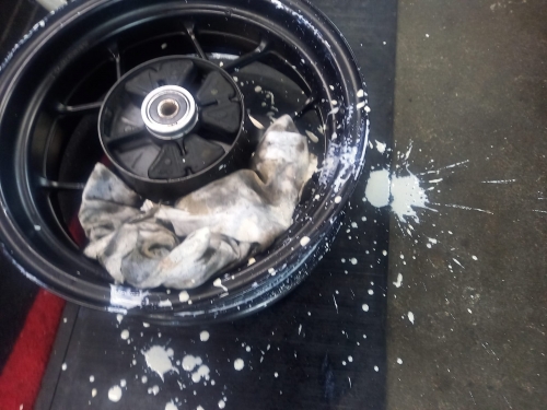 この液体は、アレを行う事で発生する物です。 時間は掛かりますが、ホイール全体を綺麗にした上で新品タイヤ組付け。 錆びついて、中々抜けなかったアクスルシャフト。