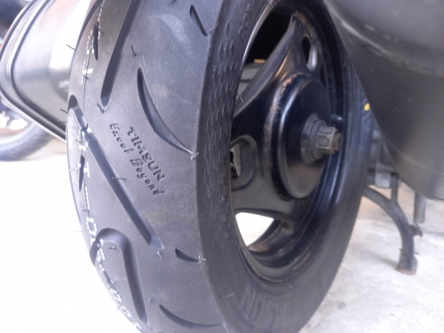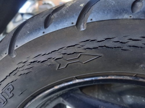 タイヤのサイド、ひび割れが目立つアドレスV125。