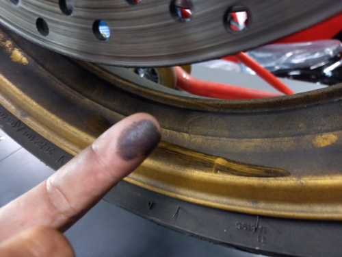 漏れたオイルがブレーキ周りに付着しており危ない状況。