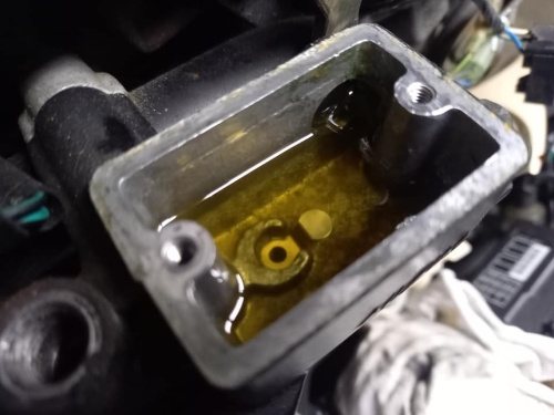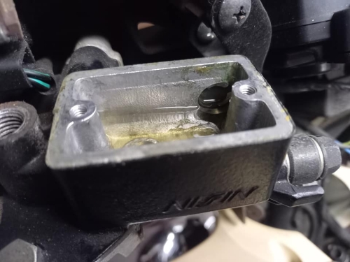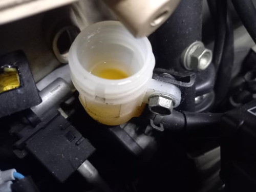 マフラーに有った傷、サービスで綺麗にしています♪ 次はSHモード125、ブレーキフルードを交換です。 前キャリパー1個に、ブレーキブリーダーが2つ有ります。 前後ブレーキを同時に動かすコンビブレーキ、エアー抜きを行います。 一番上のマスターシリンダー側、劣化しています。