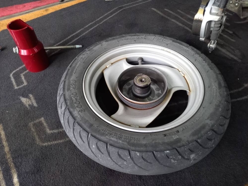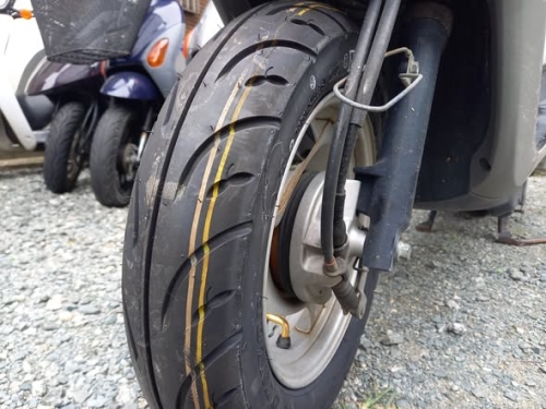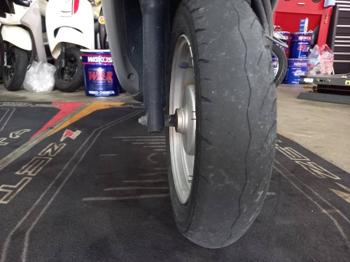 九州大学生のバイク★納車前のサービスetc2025-10-23 at 10:00AM本日は、朝4時に店オープン♪ 「前タイヤに、異常を感じて乗るのが怖い」とのジョグが入庫。 溝が減り、それとは別に空気圧もだいぶ有りません。 フロントホイールを外します。